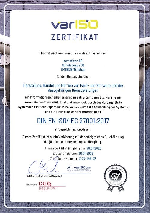 sematicon AG has successfully completed the external recertification for the international standard for information security management DIN EN ISO/IEC 27001. The renewed certification confirms the commitment of the management and employees to the highest standards in the areas of information security and data protection.