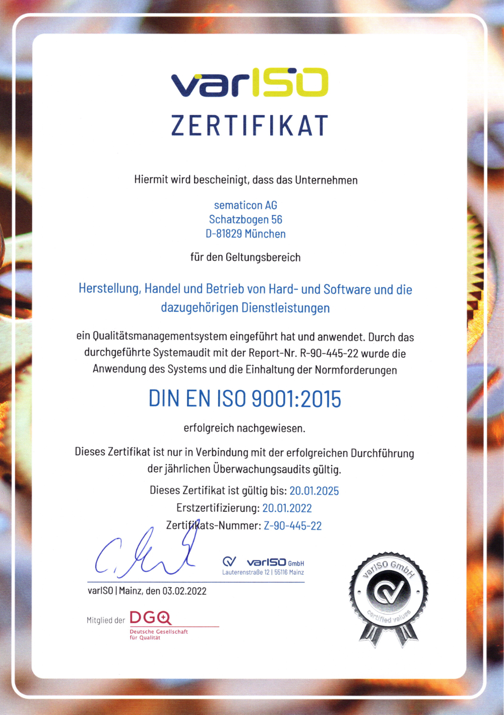 An implemented quality management system according to DIN EN ISO 9001 ensures high product and service quality. Companies only receive certification if they can demonstrate certain processes and documentation in their daily operations.We are very pleased that we meet the requirements of DIN EN ISO 9001 and have received certification after an audit by varISO.